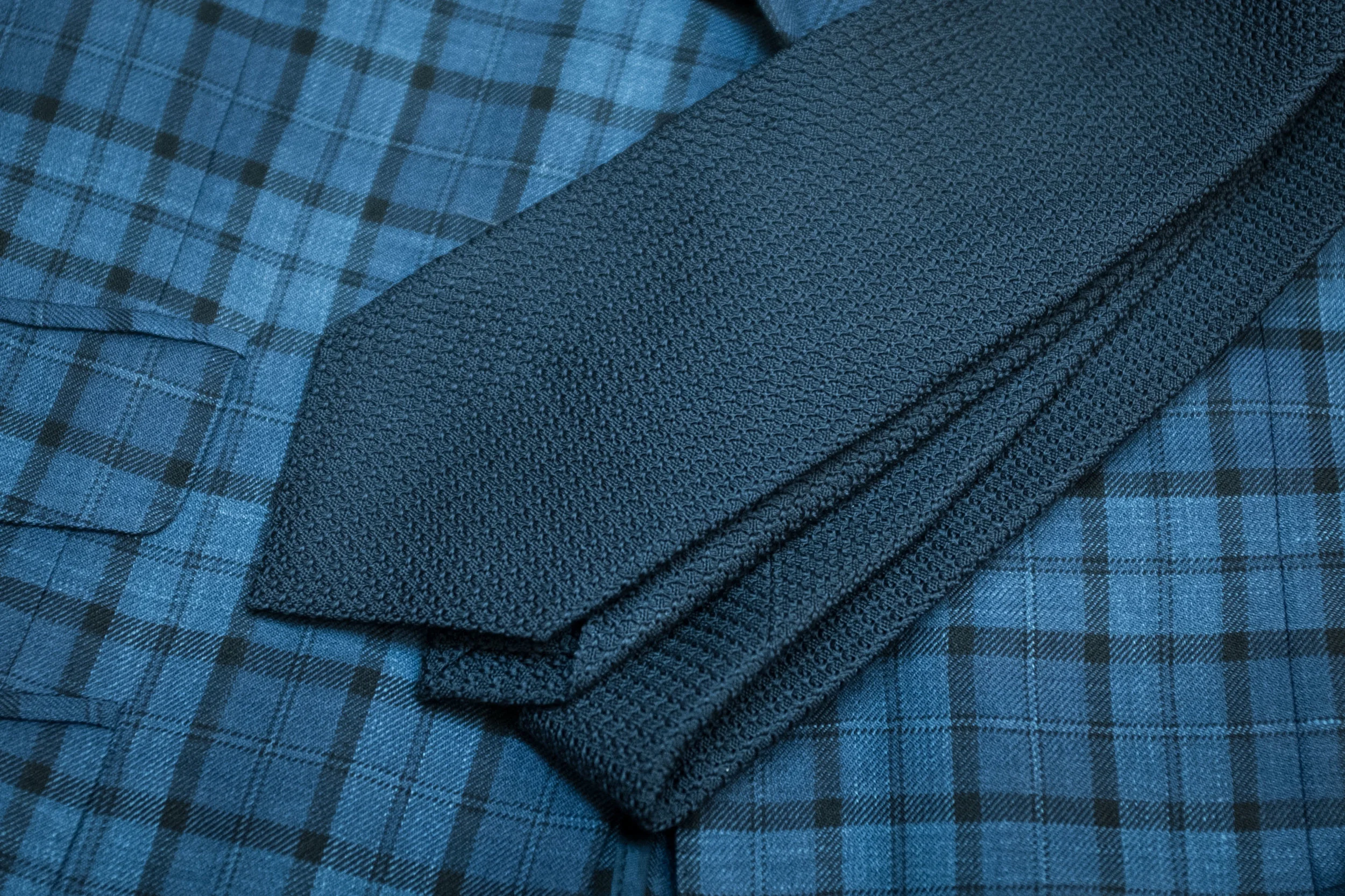 Silk Grenadine - With its quicksilver shimmer and informal texture, equally at home with suits and sportcoats, a navy grenadine is considered by many to be the single most versatile tie a man can own. Grenadine’s airy weave was originally intended to be worn in spring and summer with similarly open-weave shirts and jackets (most iconically in a maize yellow). Although grenadine’s textural dimensionality can pair well with tweed and flannel, there’s always a pleasure in reserving seasonal items for their intended climate.